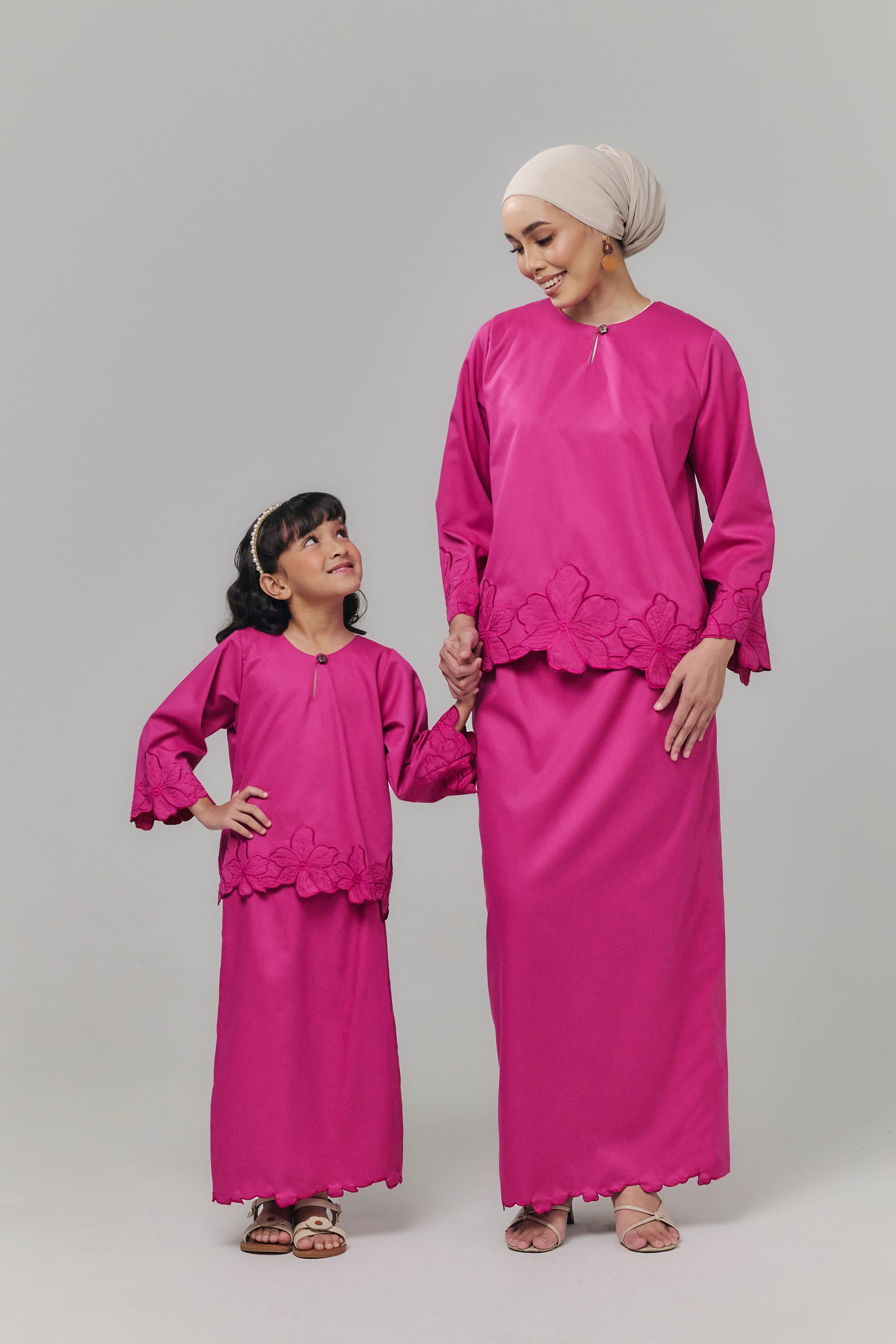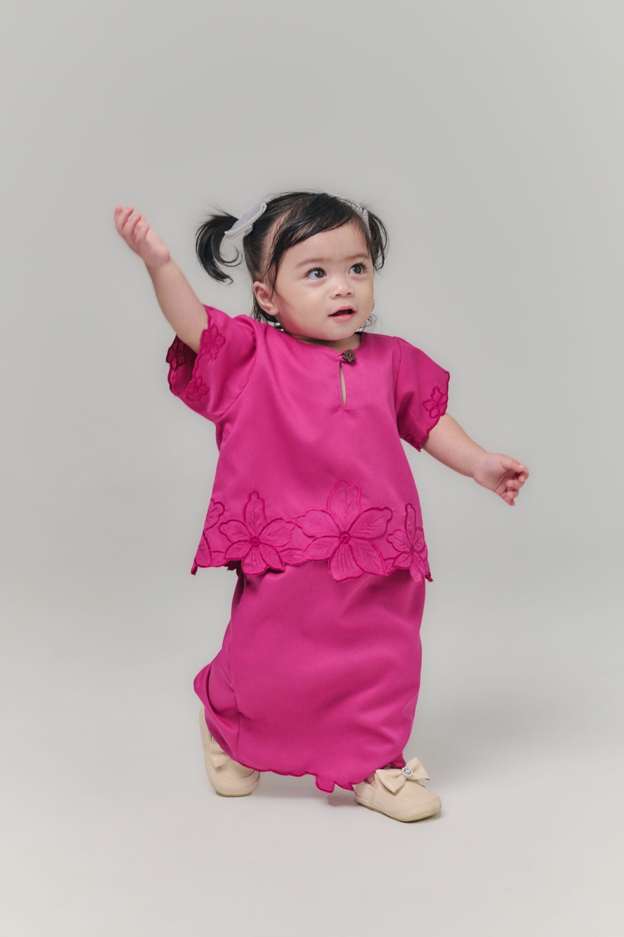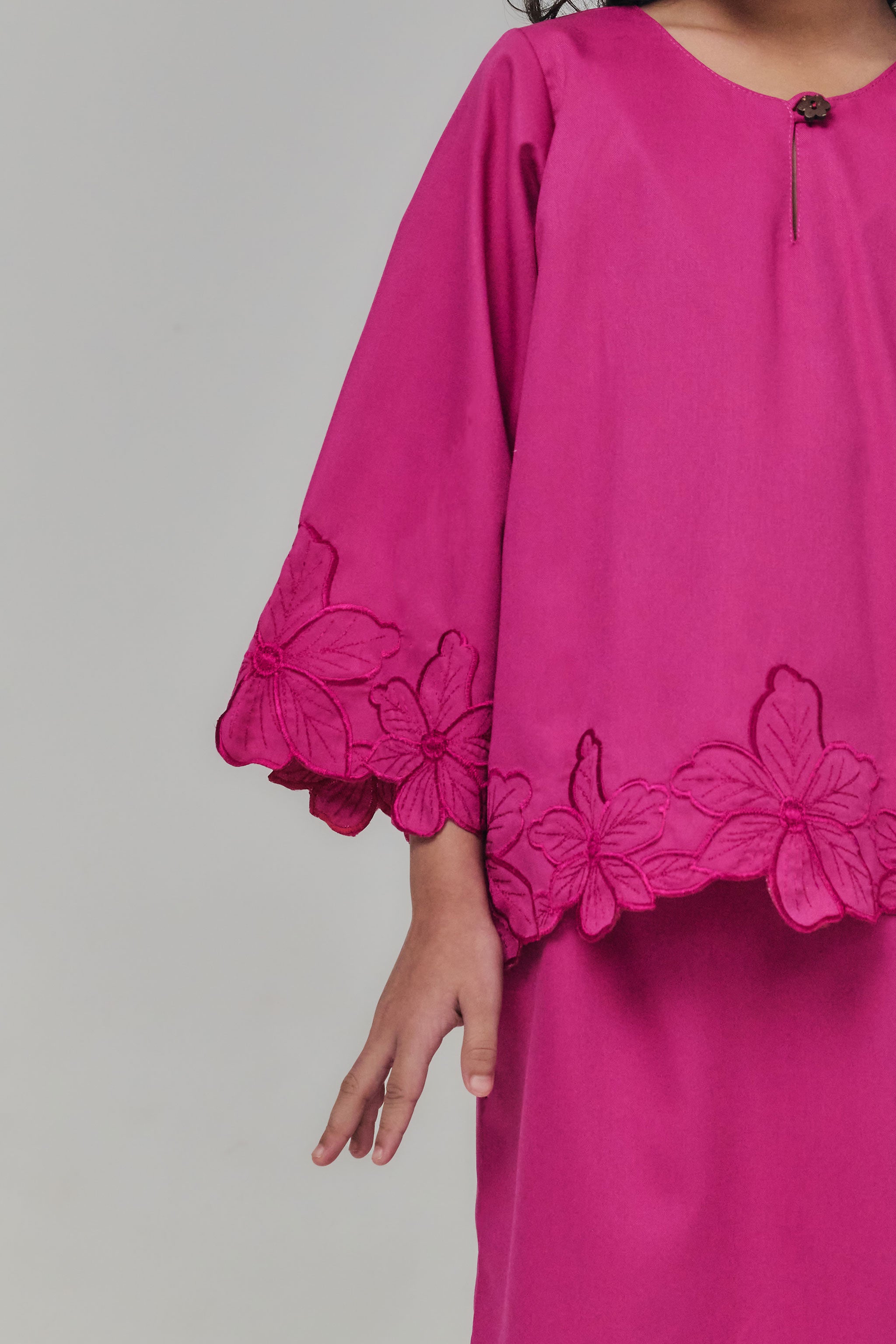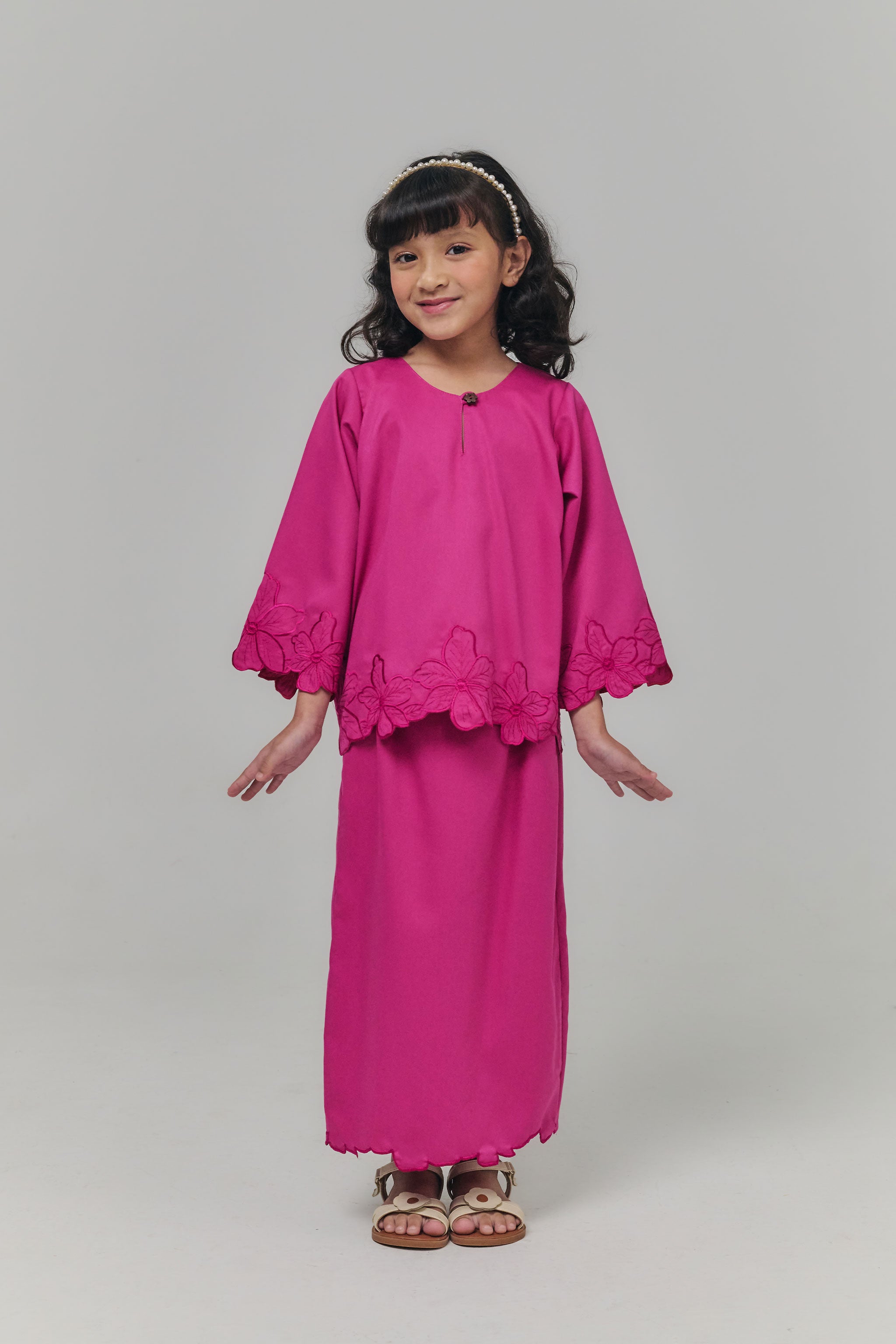 The Nada Kurung Kedah Kids brings classic charm and playful elegance together, crafted from soft, flowy fabric for effortless movement. Featuring delicate embroidery on the sleeves, lower blouse, and back pleated skirt, it highlights graceful details while keeping comfort for little ones. Paired with a pleated back skirt and subtle embroidery at the hem, this kurung is perfect for festive occasions, special events, or stylish everyday wear.