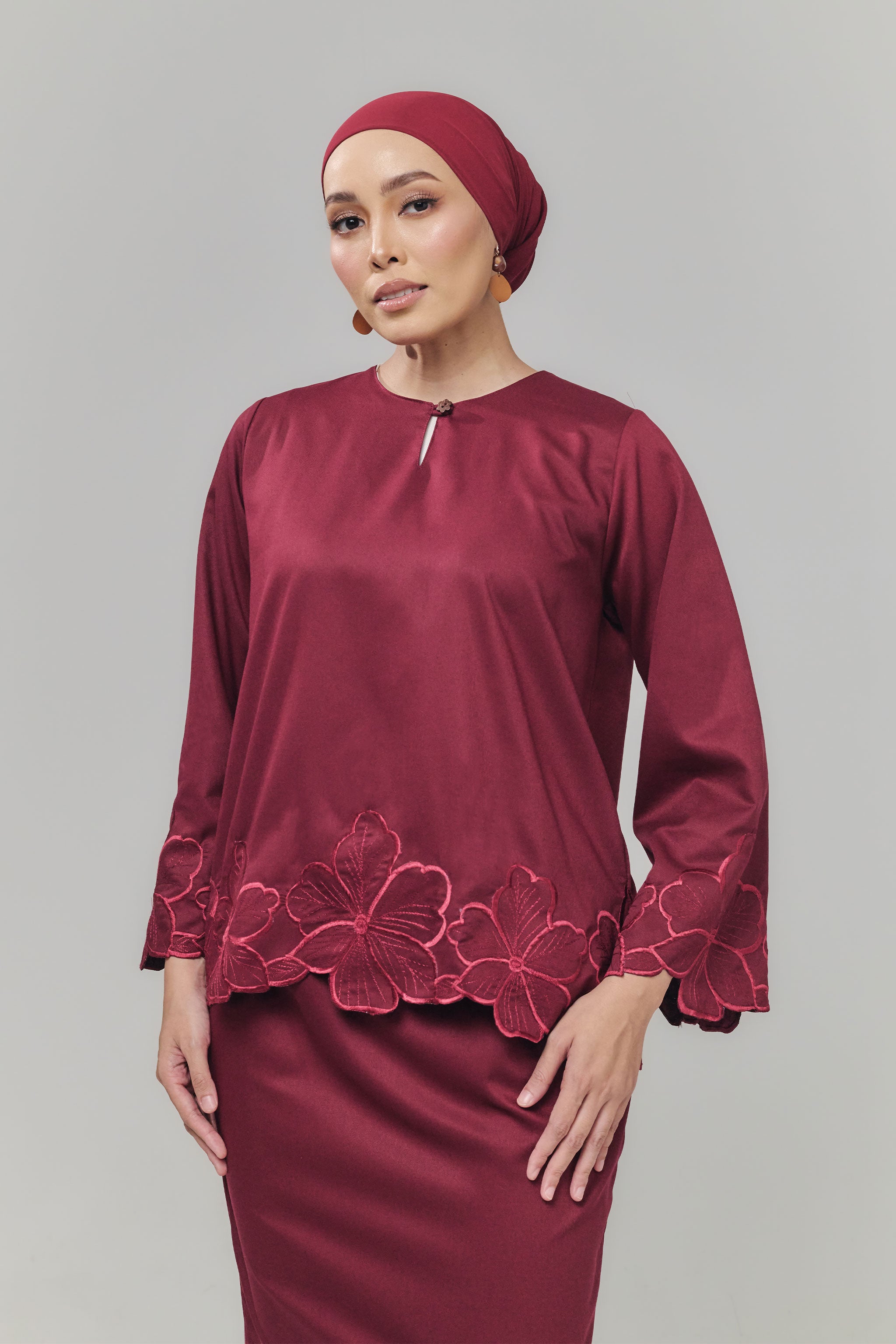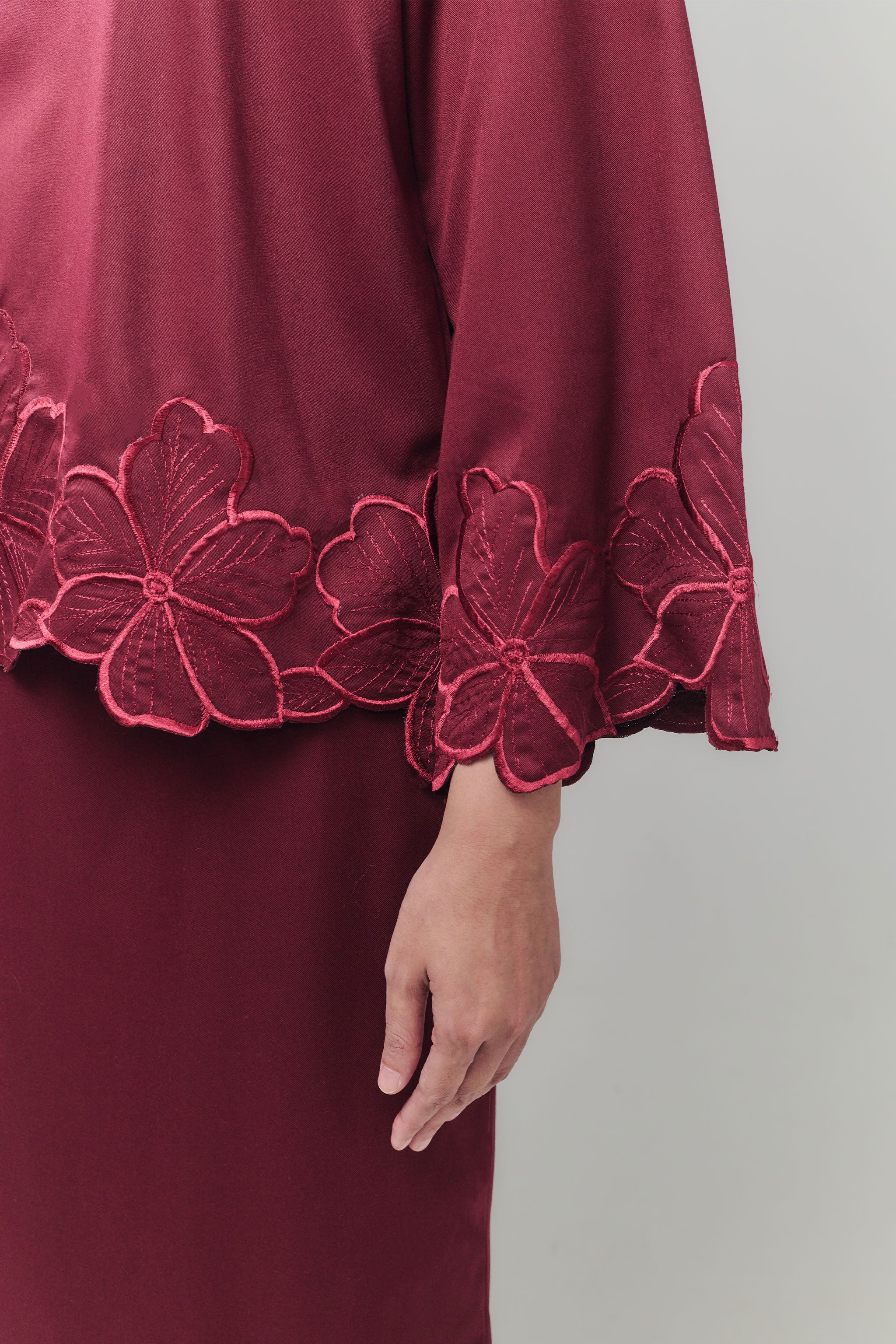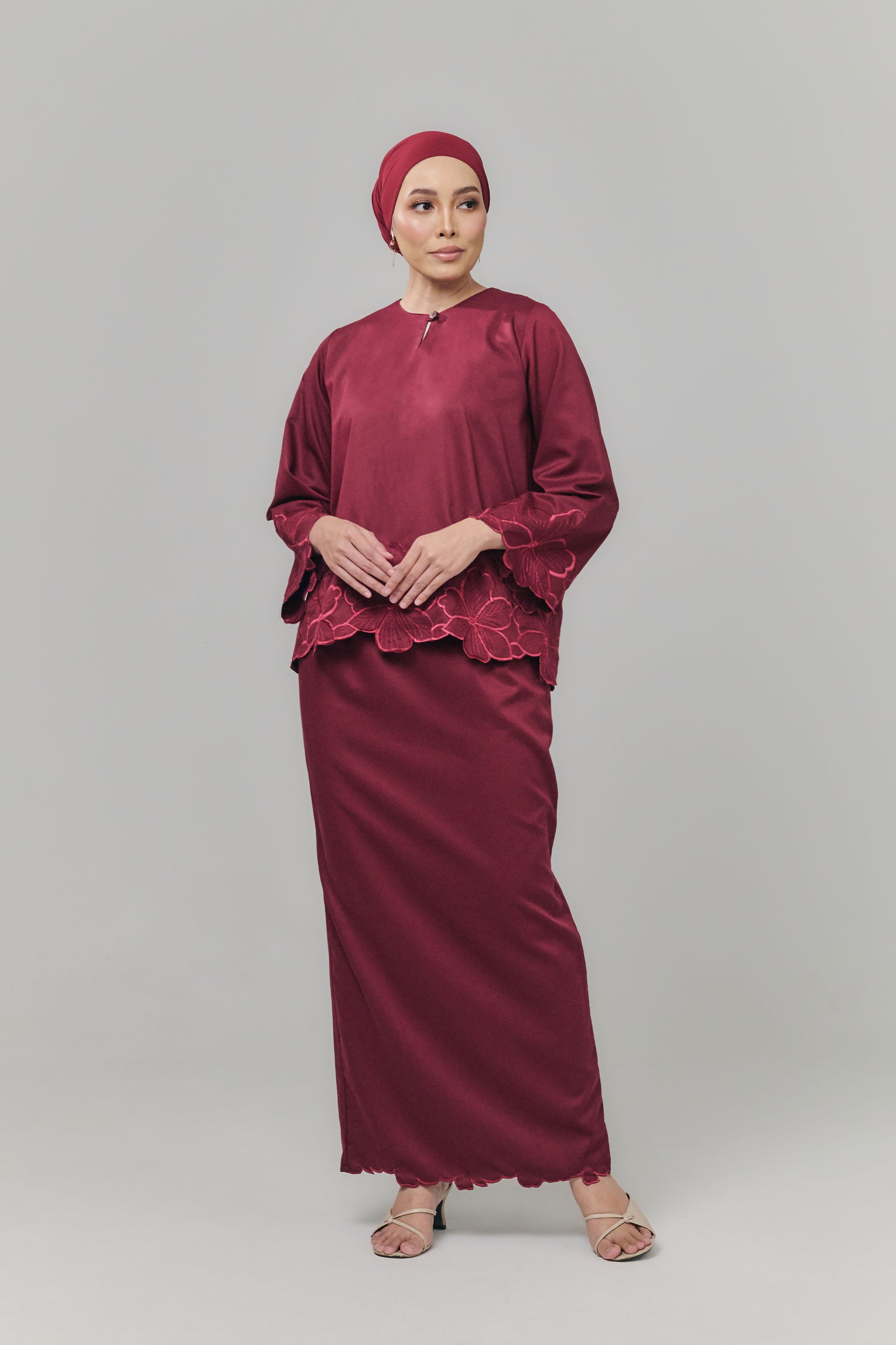 The Nada Kurung Kedah blends traditional charm with modern elegance, crafted from flowy fabric for effortless movement. Featuring delicate embroidery on the sleeves, lower blouse, and back pleated skirt, it highlights graceful details while maintaining a comfortable fit. Paired with a pleated back skirt and subtle embroidery at the hem, this kurung offers a refined silhouette perfect for festive celebrations, formal occasions, or stylish everyday wear.