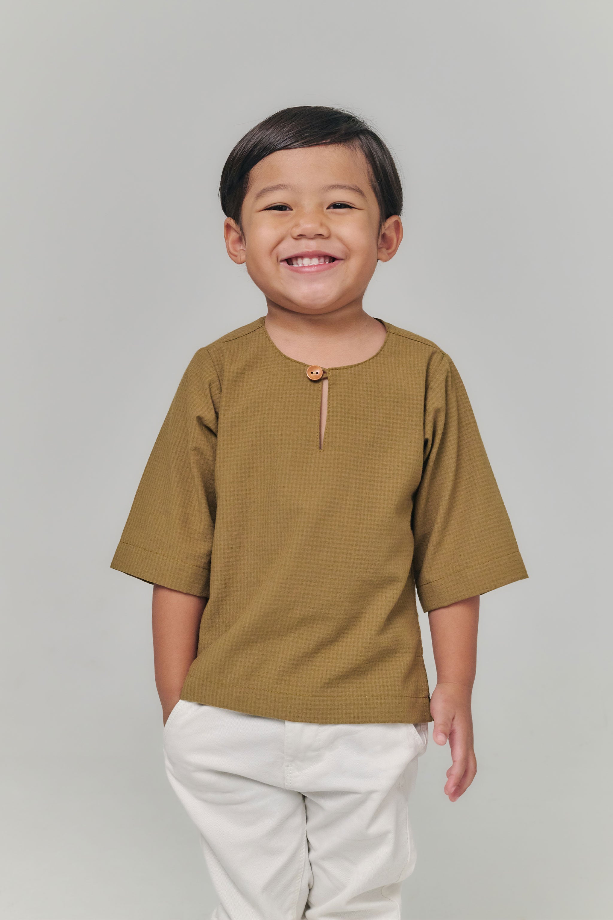 Designed with a teluk belanga neckline and 3/4 sleeves, this kurta combines classic charm with practical comfort for everyday wear, family gatherings, or festive occasions. Its relaxed fit allows easy movement while maintaining a neat, polished look.