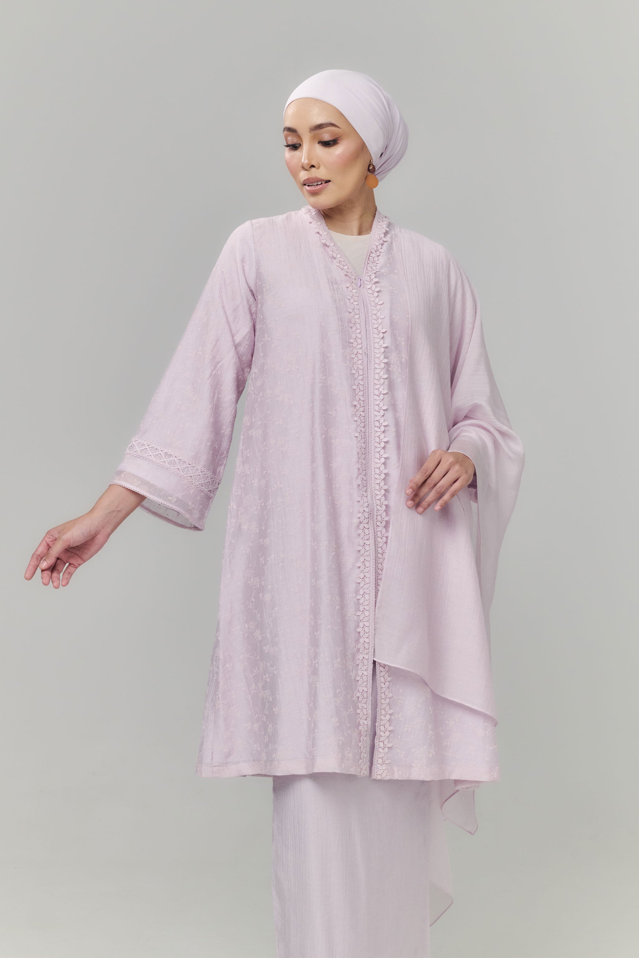 Graceful and timeless, The Seroja Kebarung Panjang brings classic elegance to modern wear its flowy silhouette and delicate lace detailing. Designed with a sleek hidden front zipper for a clean finish and paired with beautifully structured pleated back skirt, it offers comfort, movement, and effortless sophistication for any special occasion.